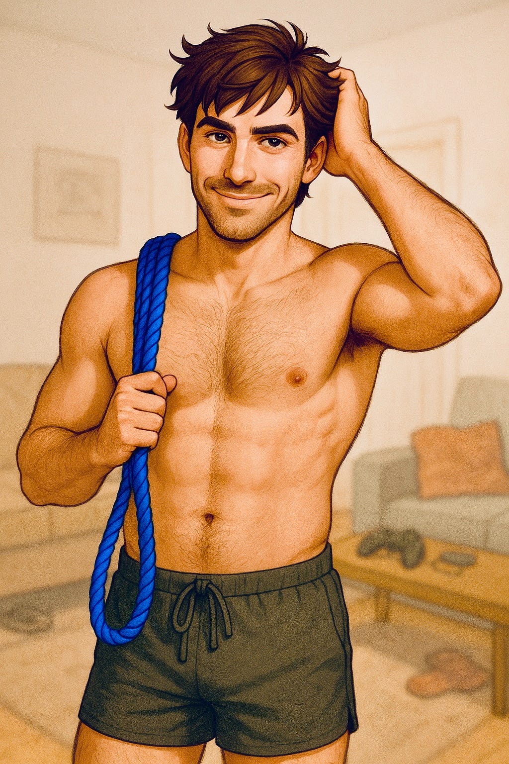 Which is why I usually keep the shibari videos to myself, tucked in between the climbing tutorials on my laptop. But tonight, four beers deep on the thrift-store couch, with my three roomie bros scattered in their mismatched thrifted chairs, the topic somehow landed on “weird hobbies,” and Dante, the one I’ve known the longest, leaned forward.